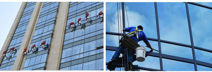 2、吊籃方式:在樓頂架設吊籃將工人運送到指定位置進行施工操作。此施工方式清洗效率較低,成本較高。